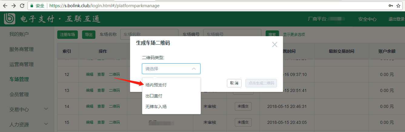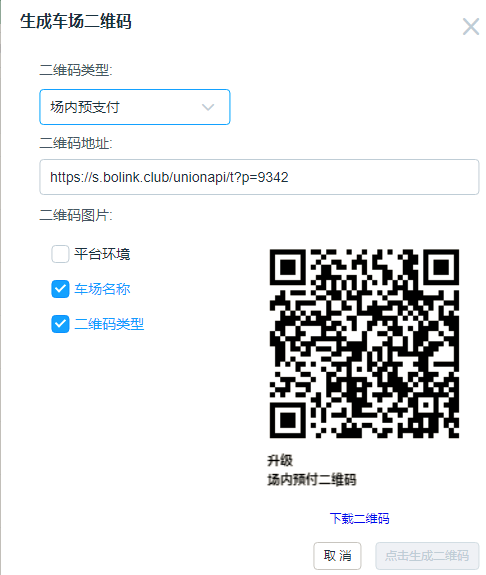 1.1、廠商平臺管理員登錄本廠商的泊鏈后臺,選擇車場管理模塊,在需要生成場內(nèi)預付碼的車場點擊“生成車場二維碼”,二維碼類型選擇“場內(nèi)預支付”,即可生成對應二維碼。可勾選該圖片下方的標記項、可下載圖片、可復制二維碼地址。