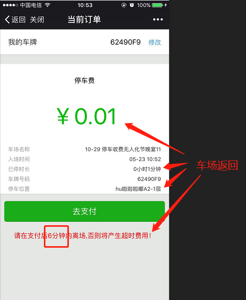 車主進入車場產(chǎn)生訂單后,在場內(nèi)可以掃車場放置的場內(nèi)預付二維碼進行預支付。
