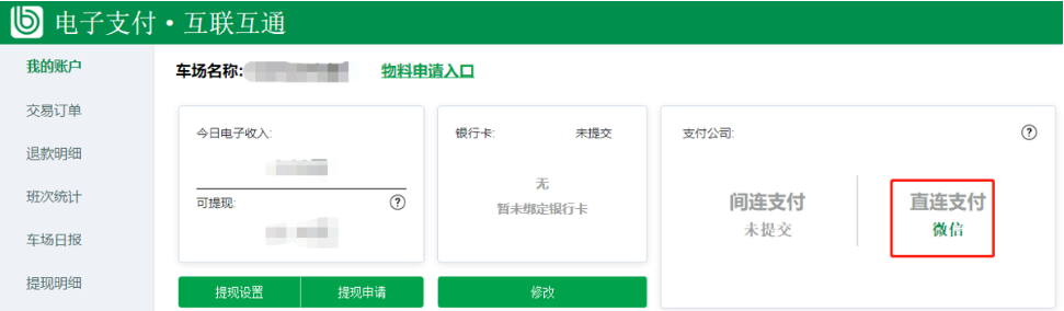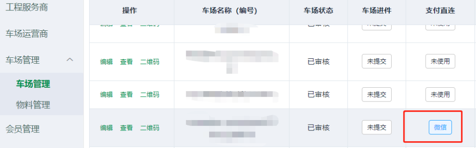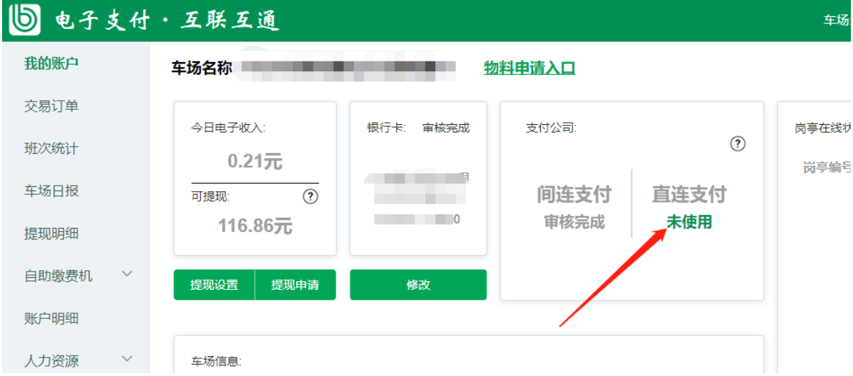 3、車場信息填寫正確,走正常的開通直連流程,車場可以在支付直連入口的“開通狀態(tài)”查看當前進展,如果是開通中的狀態(tài)的時候是不允許編輯修改的。