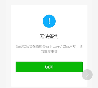 2.若進件的賬戶的微信已經(jīng)開通過小微商戶,如再次進行申請小微商戶時掃碼簽約時失敗,請更換進件賬戶信息。
