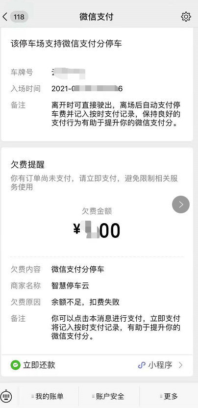 該頁面表示車主免密支付時微信沒有余額、余額不足或者沒有綁卡,微信給墊付了訂單金額,車場收到的停車費不變,需要車主還款。未還款前不支持再次微信免密支付。