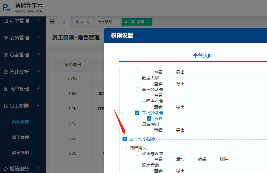 注:修改該員工所屬角色的權限時要勾選“云平臺小程序”