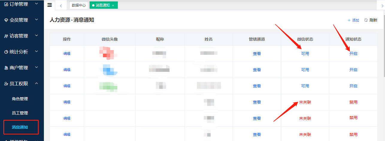 員工管理模塊的“消息通知”頁面給指定員工綁定微信,并設置接收消息推送的通道、事件類型和接收時間段(默認是全天接收),開啟推送即可。