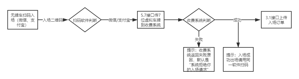 1、無牌車入場:泊鏈廠商后臺生成對應(yīng)入口的二維碼,做成燈箱等物料形式貼在入口處,車主通過微信或支付寶掃一掃,然后泊鏈發(fā)送生成的無牌車(7位數(shù)字和字母組合)入場消息給入場通道對應(yīng)的停車收費系統(tǒng),系統(tǒng)判斷是否允許入場。