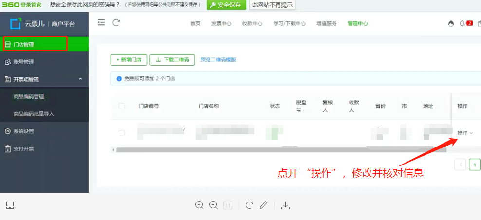 左側門店管理菜單,點擊后右側點編輯,可以修改開票人信息。![]