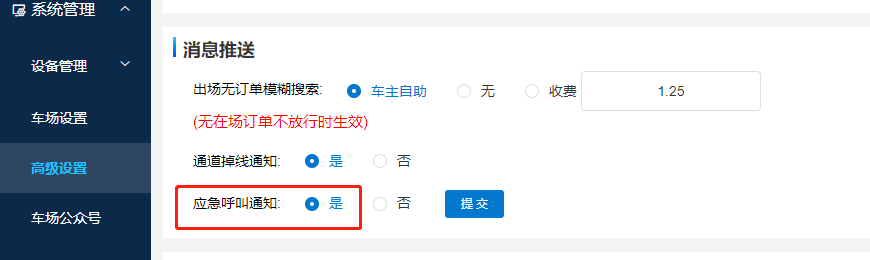 2、車場在高級設置中:選擇無訂單時“車主自助”,且打開應急呼叫通知的開關
