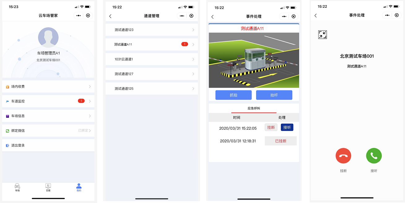 綁定微信的員工、車場管理員都可登錄“云車場管家”,查看該車場的通道信息,處理接聽呼叫和抬桿操作。