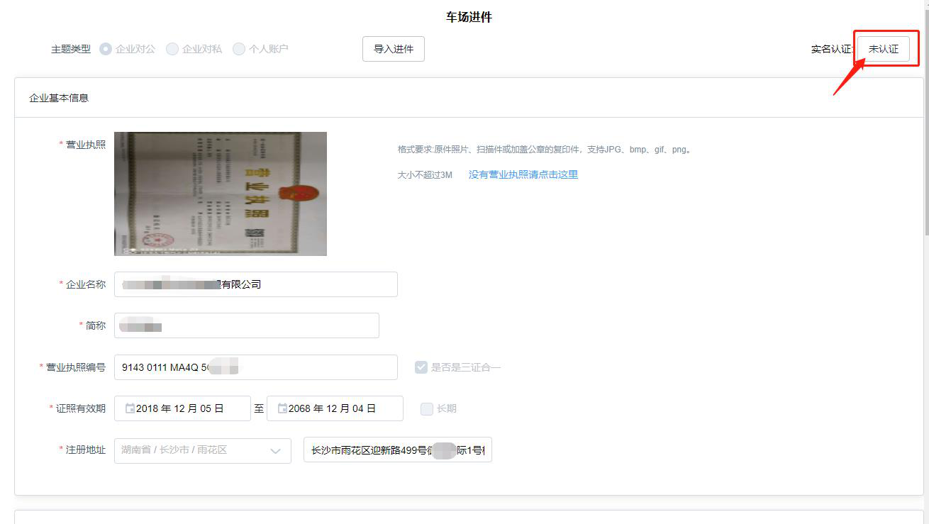 第一步:登錄后臺進件頁面右上角,點擊未認證按鈕